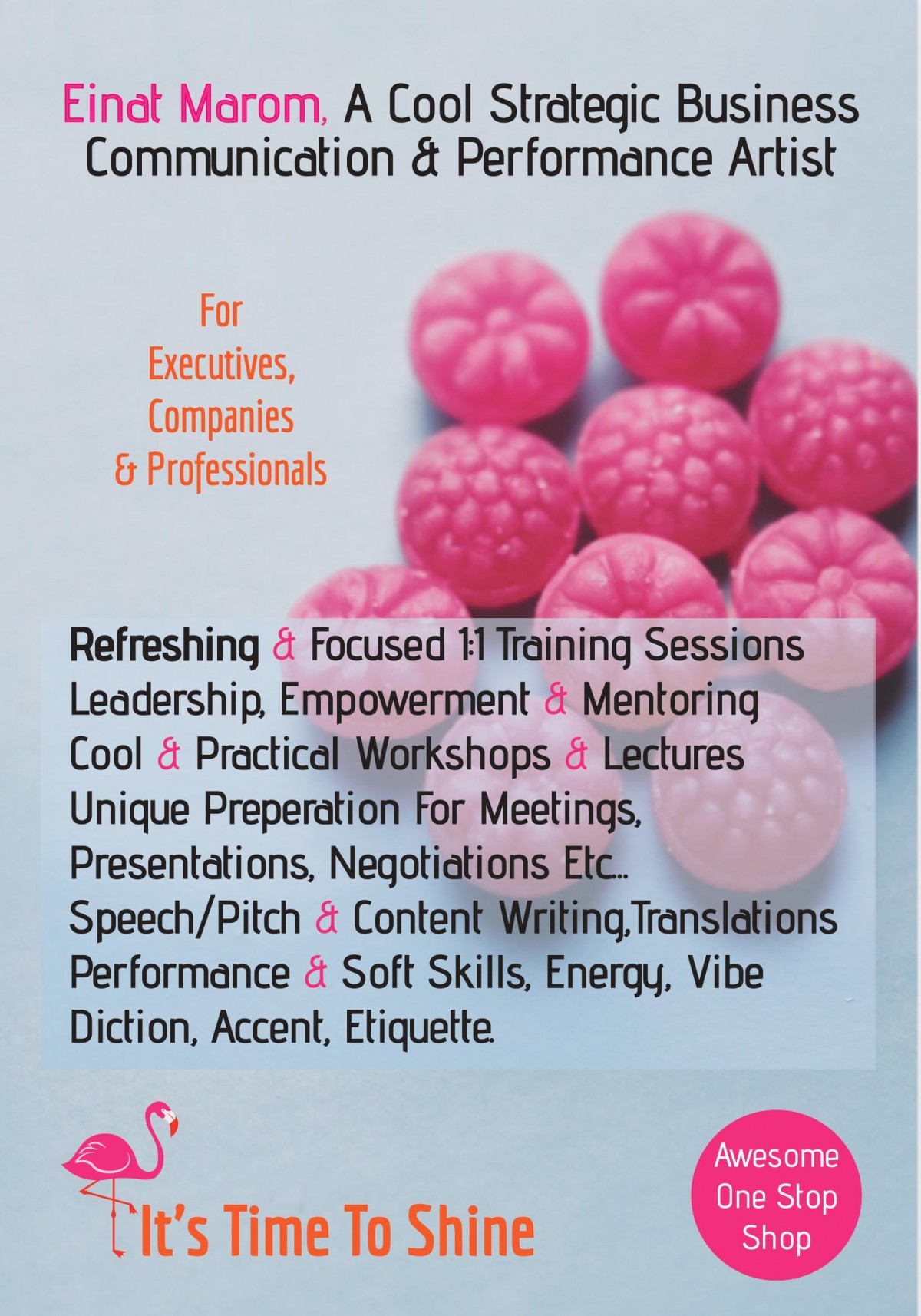 אסטרטגיה ובידול, תקשורת עסקית באנגלית/בעברית, תקשורת אירגונית וחוץ אירגונית מעצימה (באנגלית/בעברית) מבריקה וממוקדת לפי TALK SIMPLE המבוססת על ניתוח ייחודי של סיטואציות עסקיות/בינאישיות/ניהוליות ועוד, ערכים גבוהים, יושרה ועוד ועוד לפי THINK SMART, TALK SIMPLE.